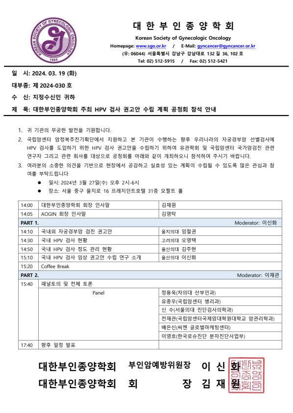 2024-030(20240319) [대한부인종양학회] 대한부인종양학회 주최 HPV 검사 권고안 수립 계획 공청회 참석 안내 조회수 : 101 게시일 : 2024-11-18 2024-030(20240319) [대한부인종양학회] 대한부인종양학회 주최 HPV 검사 권고안 수립 계획 공청회 참석 안내.pdf (다운로드 : 1회) 목록