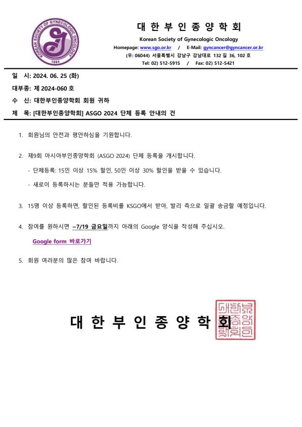 2024-060(20240625) [대한부인종양학회] ASGO 2024 단체 등록 안내의 건 조회수 : 120 게시일 : 2024-11-18 2024-060(20240625) [대한부인종양학회] ASGO 2024 단체 등록 안내의 건.pdf (다운로드 : 1회) 목록
