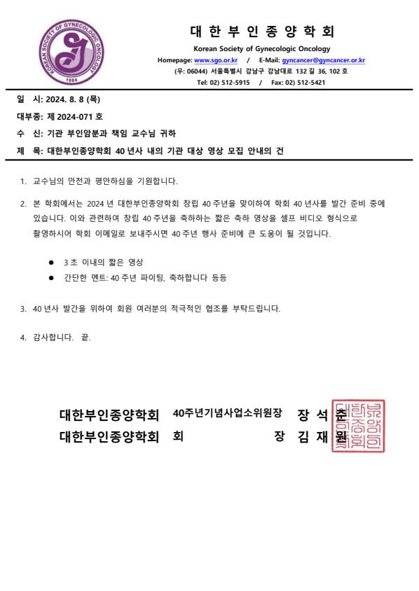 2024-071(20240808) 대한부인종양학회 창립 40년사 내의 기관 영상 모집 안내의 건 조회수 : 113 게시일 : 2024-11-18 2024-071(20240808) 대한부인종양학회 창립 40년사 내의 기관 영상 모집 안내의 건.pdf (다운로드 : 1회) 목록