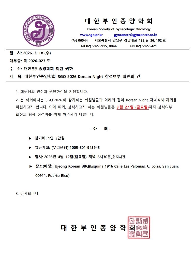 2026-023(20260318) [대한부인종양학회] SGO 2026 Korean Night 참석여부 확인의 건 조회수 : 10 게시일 : 2026-03-18 2026 023 20260318 대한부인종양학회 SGO 2026 Korean Night 참석여부 확인의 건.pdf (다운로드 : 0회) 목록