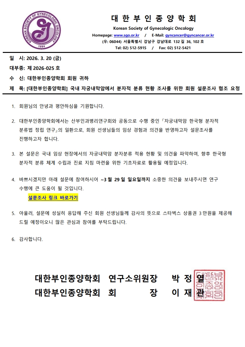 2026-025(20260320) [대한부인종양학회] 국내 자궁내막암에서 분자적 분류 현황 조사를 위한 회원 설문조사 협조 요청 조회수 : 3 게시일 : 2026-03-20 2026 025 20260320 대한부인종양학회 국내 자궁내막암에서 분자적 분류 현황 조사를 위한 회원 설문조사 협조 요청.pdf (다운로드 : 0회) 목록