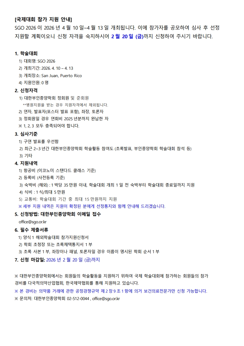 SGO 2026 국제대회 참가 지원 안내 조회수 : 13 게시일 : 2026-02-03 SGO 2026 국제대회 참가 지원 안내.pdf (다운로드 : 0회) 양식1. 해외학술대회 참가지원신청서.xlsx (다운로드 : 0회) 목록