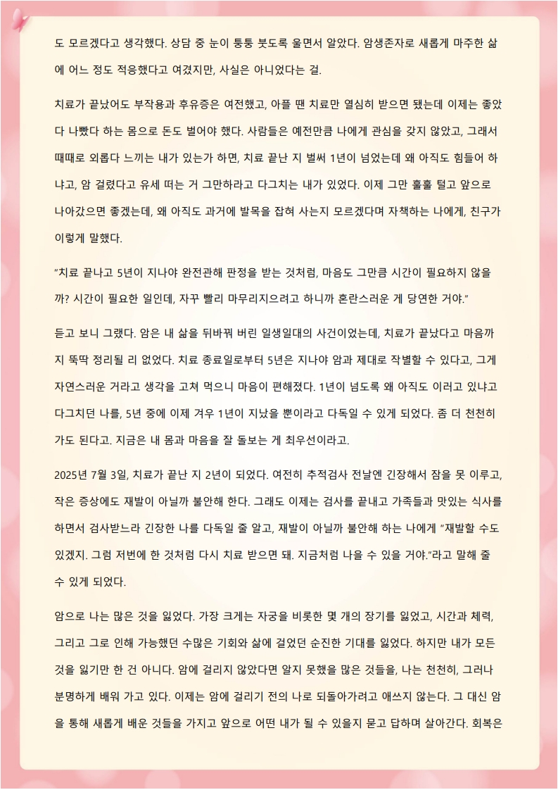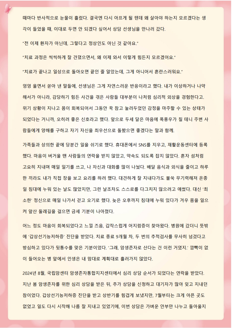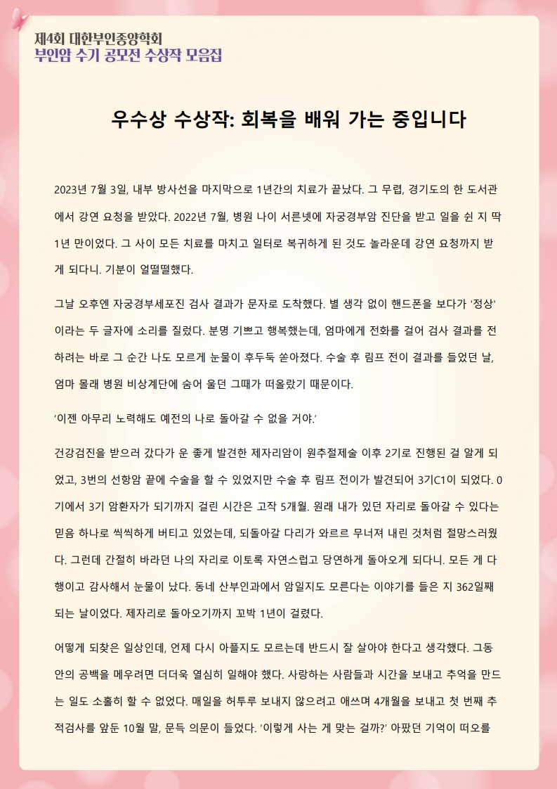 희망스토리 학회소개 자궁경부암 자궁체부암 난소암 기타암 표적/면역치료 부인암 생활권고안 병원찾기 환자가 작성하는 부인암 투병기 의사가 작성하는 부인암환자들의 투병기 환자가 작성하는 부인암 투병기