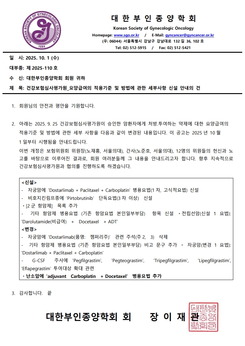 건강보험심사평가원_요양급여의 적용기준 및 방법에 관한 세부사항 신설 안내 조회수 : 54 게시일 : 2025-10-02 2025-110(20251001) [대한부인종양학회] 건강보험심사평가원_요양급여의 적용기준 및 방법에 관한 세부사항 신설 안내의 건.pdf (다운로드 : 333회) [건강보험심사평가원] 공고전문_20251001.pdf (다운로드 : 349회) [건강보험심사평가원] 주요공고개정내역_20251001.pdf (다운로드 : 334회) 목록